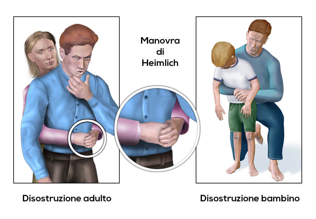 A seguire, Primo Soccorso in caso di soffocamento: Manovra di Heimlich negli adulti o bambini maggiori di un anno